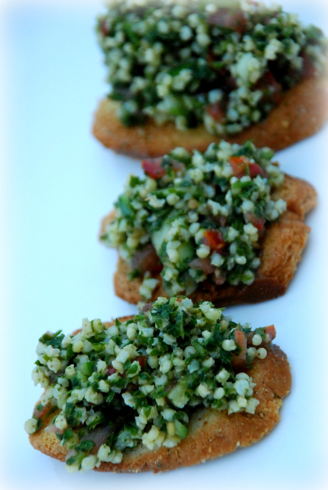 I did not use a recipe, just ingredients that I had on hand and an idea in my head of what tabouleh should be. I chopped some grape tomatoes and decided to add something a little unconventional, but not too far off the rocker: a handful of diced cucumber. Traditional tabbouleh has grains mixed in, and I just happened to have a little bit of millet that I’ve been meaning to use up. Very soon, I scooping bite after bite onto my favorite crackers, indulging in the aromas of a delicious summer salad.